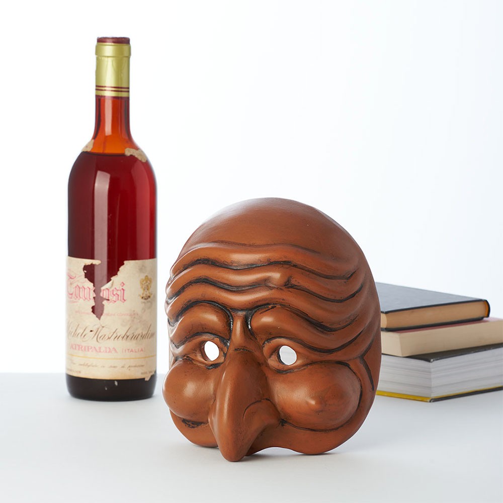 The terracotta Pulcinella mask medium size, designed by Macrì, is produced in terracotta, modeled and painted completely by hand. It can be hung on the wall, placed on a desk or shelf and is contained in an elegant artisan case.